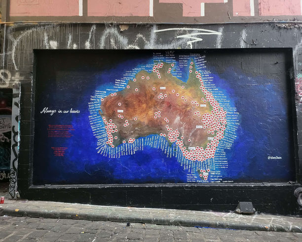 The Femicide Nation mural is a collaboration between journalist and femicide researcher Sherele Moody and artist Dans Bain. It is based on Sherele's ground-breaking ongoing project the Australian Femicide and Child Death Map, which holds the stories of 2500 women and children killed in Australia.