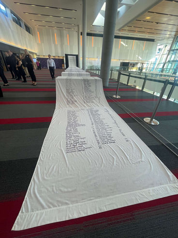 The Lost Petition is an ongoing textile artwork that lists women and children who have lost their lives to male violence in Australia from 2008. This work is 30 metres long and proceeds to grow in length as women and children’s lives continue to be lost to male violence.