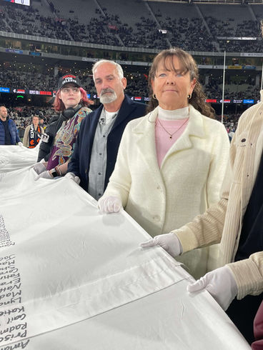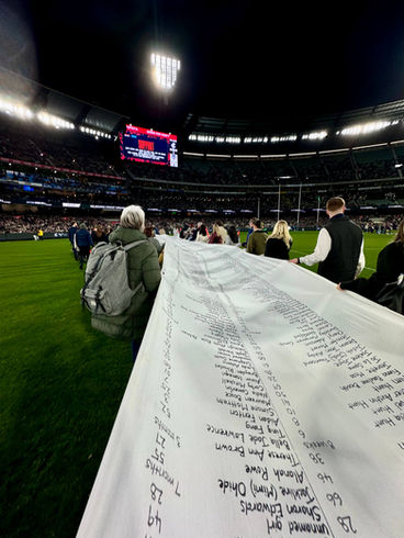 Whenever possible, I engage directly with survivors of violence and the families of victims. On this occasion I was able to invite some members of this community alongside advocates to assist with carrying The Lost Petition onto the oval. As we gathered on the grass surrounded by a 75 thousand strong crowd, the lights were dimmed and orange lights illuminated the Lost Petition for one minutes silence for the victims.